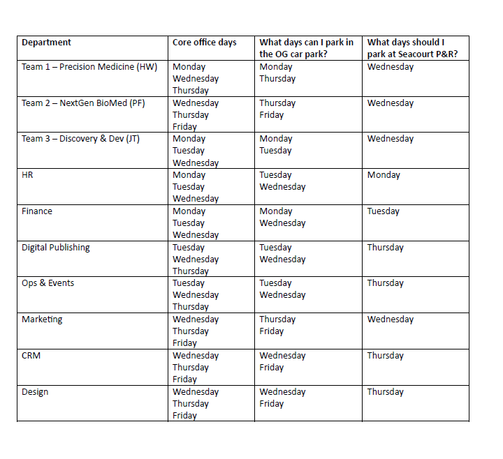 Out of these three days, all staff have two fixed days per week when they can park their vehicle at the office (in an Oxford Global parking space). Outside of this, when attending the office on any of the remaining 3 days, staff should use one of the Park & Ride carparks around the city. Staff can claim the cost back of this parking by submitting an expenses claim to the finance team.