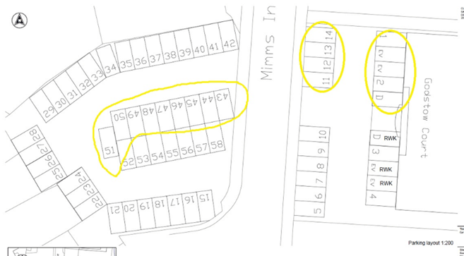 Front car park (EV1 & EV2 for electric vehicles only): 1, EV1, EV2, 2, DDA, 11 to 14