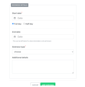 2. Complete the sickness form to mark you as off sick – do not add an end date, this should only be added when you return to work. This will trigger an email to your manager to inform them you are sick: