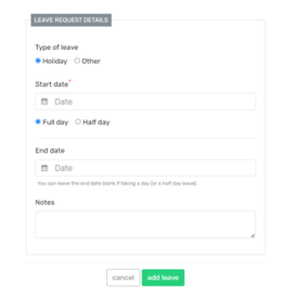 2. Complete the holiday request form, including a start/end date – you can select “half day” for AM/PM only leave. It’s recommended to add notes to keep track of your holiday usage, or if there is something your manager needs to be aware of: