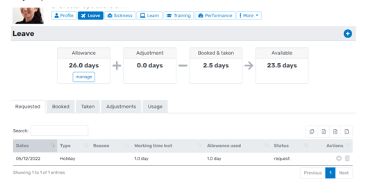 3. Your request will be sent to your manager, and you can check on outstanding holiday by visiting the “Leave” section on your profile: