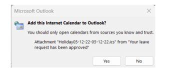 5. Add your leave to your personal calendar so people can see you are away when requesting meetings – open the calendar attachment and click Yes: