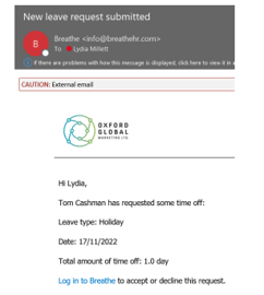 1. An email from Breathe will come through to you when a member of your team submits a holiday request. Click the link to login: