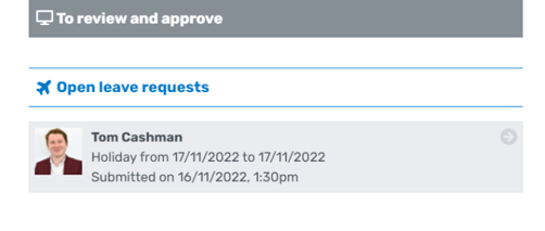 2. On your manager Dashboard, you will see any outstanding leave requests. Click on the arrow to open the request: