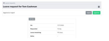 4. If rejecting the request, you’ll need to put a reason in. If approving, this notifies the employee and automatically updates the holiday calendar.
